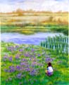 從小女孩、紫色的小野花、一塊沼澤地,到遠方的原野和天空,是一個美麗的自然風景。不過,背對著我們的小女孩,蹲在那裡作什麼?