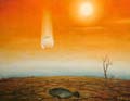 這件作品,有一點超現實,空洞的大畫面,充滿冥思的意味。一滴水,從天而降,像是流星撞地球那麼驚人。