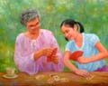 ㄚ,問了畫家,才知道這幅畫,原來畫的就是他的媽媽和女兒,她們正在玩撲克牌。孫女正在偷看ㄚ媽的牌,ㄚ媽把牌遮起來。