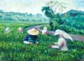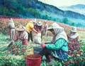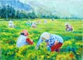 採茶、採菊、採菸、採洛神的農婦,在台東炙熱之陽的曝曬下,都用布巾將身體和臉緊緊包裹著。這些布巾和衣著的花色,與田園裡的農作物,相互融合與對話,形成大自然美景。這些畫作的線條粗鄙,顯然未經太多修飾而刻意保留了與土相似的況味。
