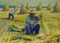 農夫、農婦,或豎起的草堆,有秩序的鋪陳在大地上-工作的場域。《選草》4號F油畫中,戴著斗笠的農夫,有著粗壯的手臂,他背後的農婦所站立的姿勢顯然沒有都會仕女的優雅,她的雙腿,像是有力的支架釘在稻田上,可以抵擋強大的風雨而不至於倒下。畫家略去農夫的面孔以便突顯他的動作,以及堅挺成束的稻草。農夫農婦背後六個草堆,以似似而異的形狀、大小、遠近、方向錯置著。