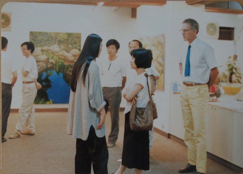 1987年在台北南畫廊舉行個展,William H. Wilson (右一)親自主持。他崇尚中國畫家范寬的藝術境界,作品也透出寧靜的意境。